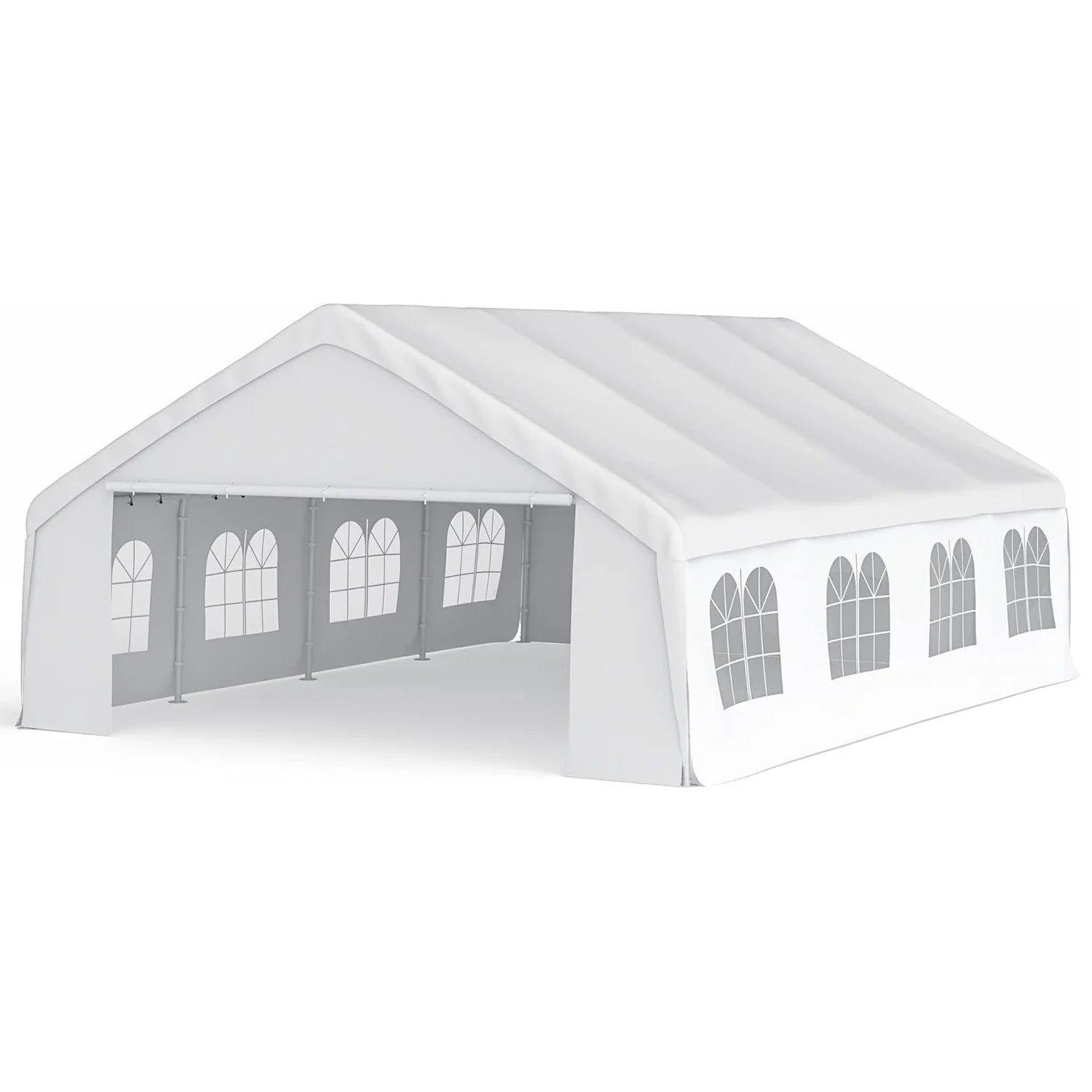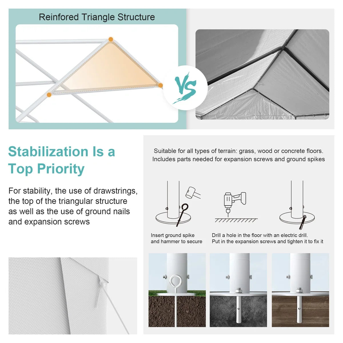Carport comes with a high-quality polyethylene top cover that provides resistance to wind and rain, and offers up to 520 square feet of UV protection, blocking 90% of the sun's harmful rays. the heavy-duty, rust, and corrosion-resistant galvanized tube steel framework, with 10 legs, offers more stability. A multipurpose carport can be used for various purposes, such as a party tent, carport, wedding tent, portable garage, storage shelter, and commercial event tent.
