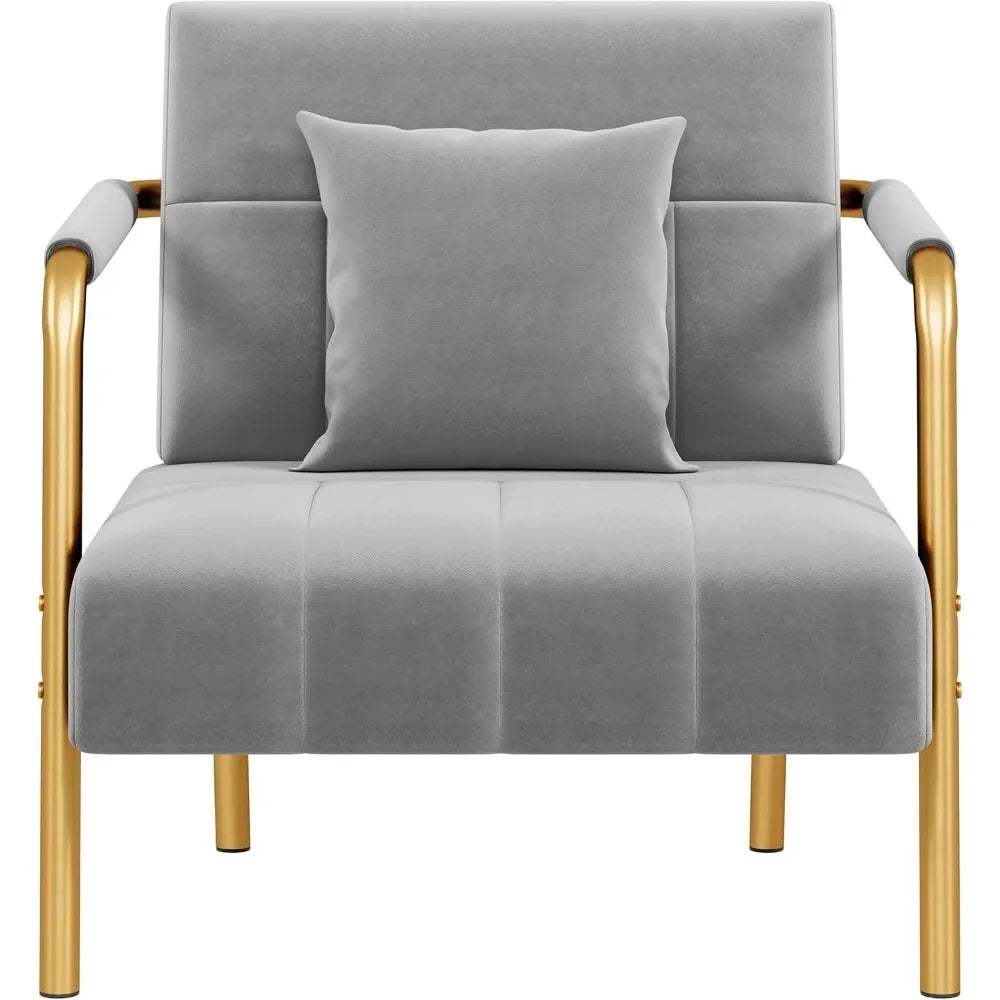 Sturdy & Cozy Upholstered Chair: Wrapped in soft, durable velvet-like fabric, this large living room chair combines an engineered and solid wood frame with sleek metal armrests and legs, supporting up to 300 lbs for long-lasting comfort and stability Slanted Back with Soft Pillow: Designed with a comfortable reclining angle, the backrest encourages a naturally relaxed posture, while a plush, fiber-filled pillow provides added softness and support, making your leisure time even more enjoyable Modern Glam Allure: This glamorous accent chair combines simple, clean lines, luxurious velvet upholstery, and gold-finished splayed legs, introducing a chic modern glam style to your living space or office. Pair it with a matching glam style sofa or side table to create a refined conversation area Soft & Bouncy: The seat cushion is filled with high-resiliency foam and supported by five thick sinuous springs for the ideal balance of softness and support. The polyester fiber-filled throw pillow helps you kick back and relax completely Versatile Placement: Measuring 30″ W × 28.5″ D × 30″ H, this modern armchair can refresh any space, large or small. Use it as a comfortable reception chair in a home office, a cozy bedroom chair, or an accent piece in the living room, studio, dressing room, and more
