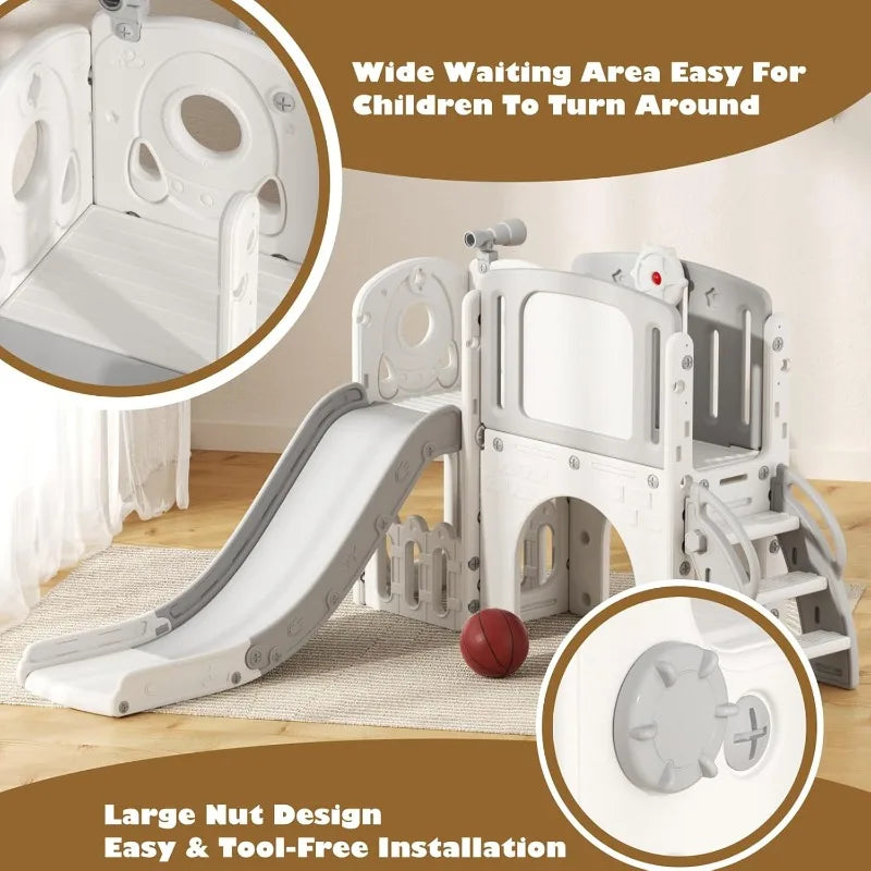 • Multifunctional Toddler Playground: This indoor playground is designed specifically for children aged 1-3, including climbing stairs, extra long slides, crawling tunnels, aisle, basketball hoops, telescope, drawing boards, and storage space. The multifunctional indoor slide not only allows kids to experience various forms of fun, but its storage space makes it convenient to store basketballs or other toys, keeping your home organized.