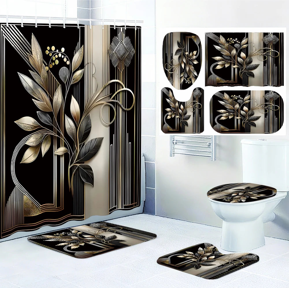 Black and Gold--curtain, mat, toilet lid top