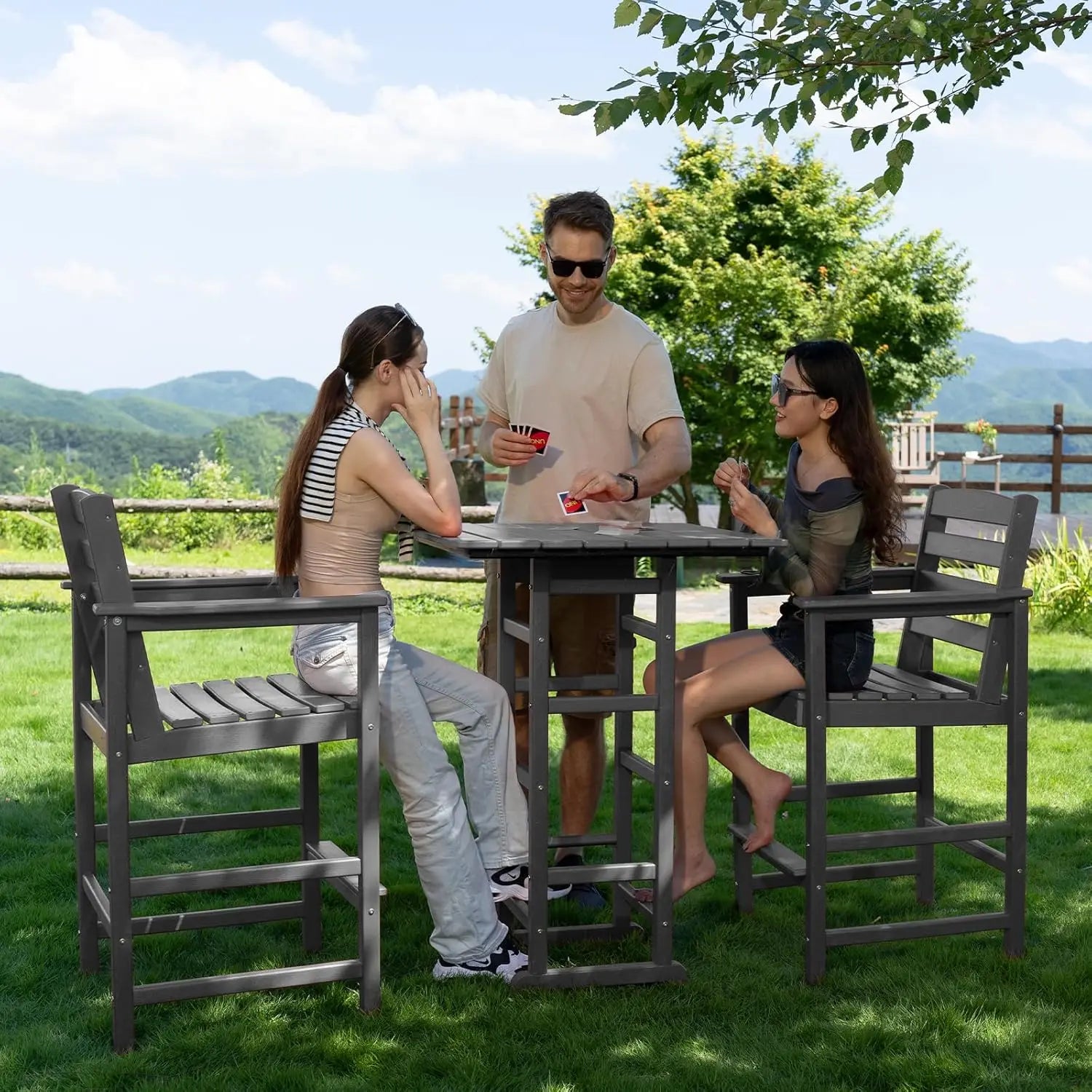 🐳 5-Year Warranty & Timeless Outdoor Style:Covered by a worry-free 5-year warranty and 24/7 customer support. With a classic Adirondack silhouette and modern bar height, this set blends beautifully into any balcony, backyard, garden, or patio for a timeless, upscale outdoor upgrade.
