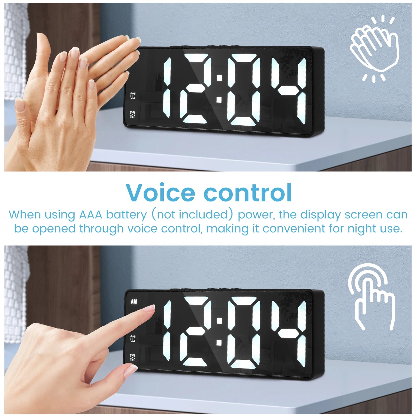 3. Dual power supply: The alarm clock can be powered by a USB cable or 3 AAA batteries (batteries not included)