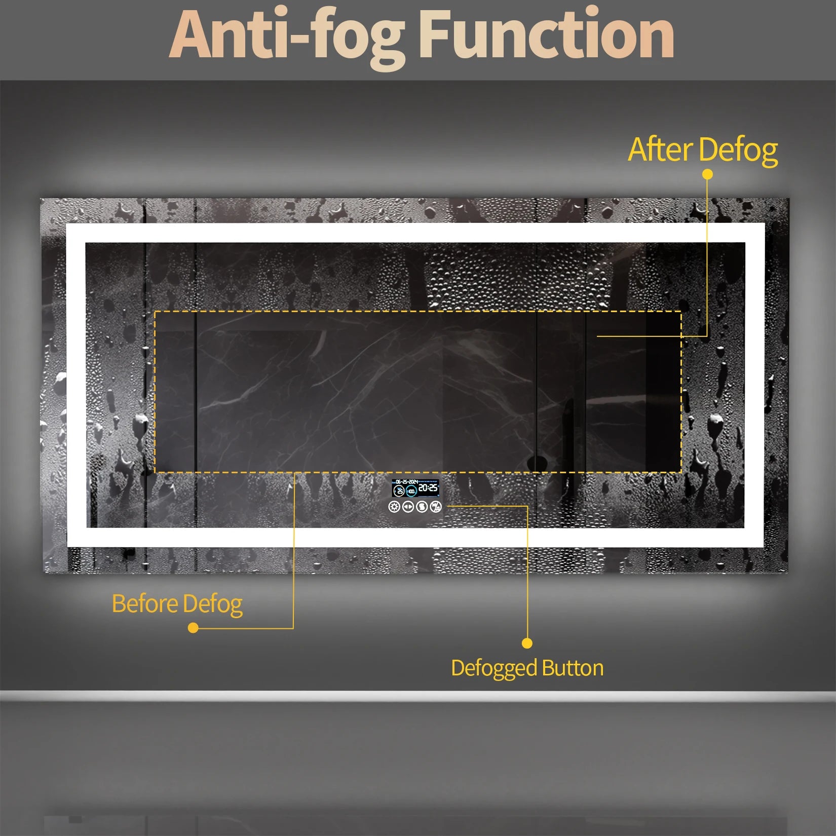 Anti-fog System & Memory Function: The smart mirror features memory function, means when you turn on the switch, the mirror will restore the lighting and brightness last used, saves your time, no need to readjust the lights again, then built-in demister pads eliminate large patches of steam on your mirror, works within 3-4 minutes when taking shower, keeps the mirror fog free and always clear images, four buttons on the screen to independently control the on/off & brightness, lighting colors, defog system and music