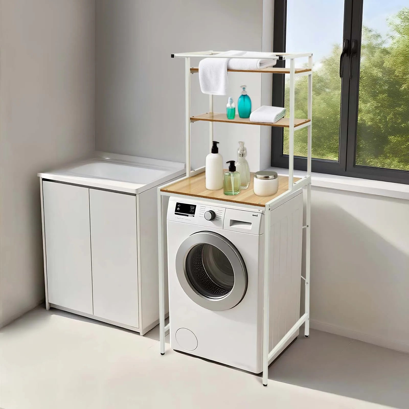 Ample Storage Space: The upper three-tier design can store small storage baskets, flower pots, skin care products, cosmetics, and cleaning supplies such as laundry detergent and sanitizer, and the large compartment at the bottom is for putting your washer. The top crossbar design is for hanging towels, clothesline, and other items. Categorizing and storing them in a neat and orderly manner will make your bathroom cleaner and neater.